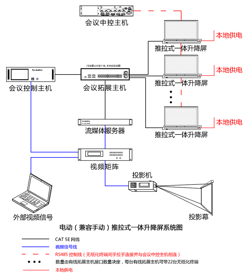 3、系統可(kě)以擴展第三方網絡中控,從(cóng)而實現(xiàn)任意會(huì)議(yì)終端(經過授權)随時(shí)對(duì)周邊設備進行(xíng)控制(zhì );第三方中控可(kě)通(tōng)過RF/RS 485協議(yì)對(duì)升降進行(xíng)統一(yī)控制(zhì)。