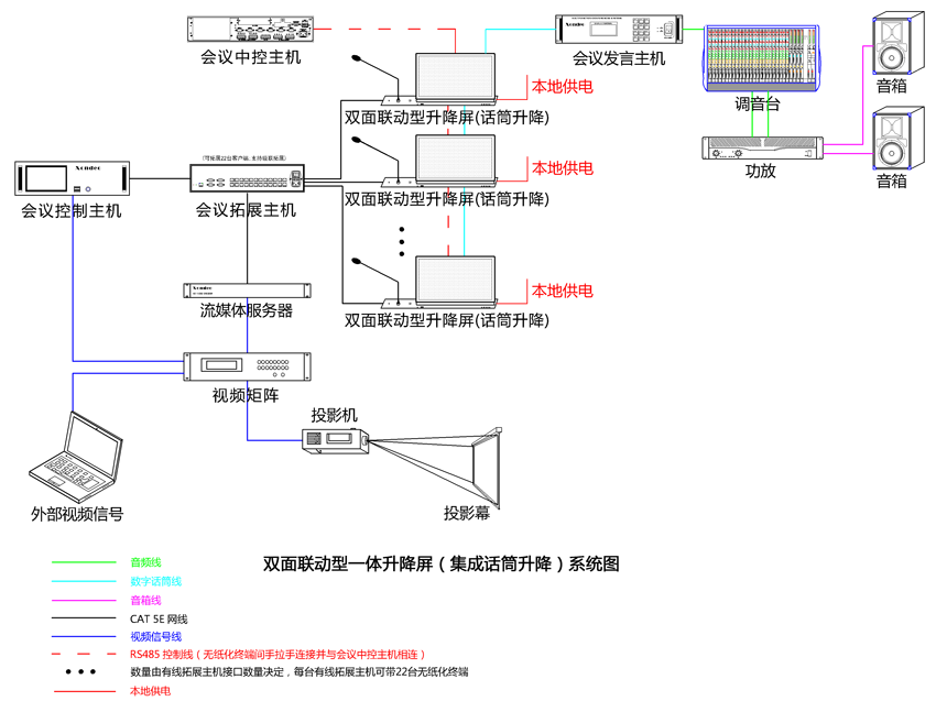 3、系統可(kě)以擴展第三方網絡中控,從(cóng)而實現(xiàn)任意會(huì)議(yì)終端(經過授權)随時(shí)對(duì)周邊設備進★行(xíng)控制(zhì);第三方中控可(kě)通(tōng)過RF/RS 485協議(yì)對(duì)升降進行(xíng)統一(yī)控→制(zhì)。