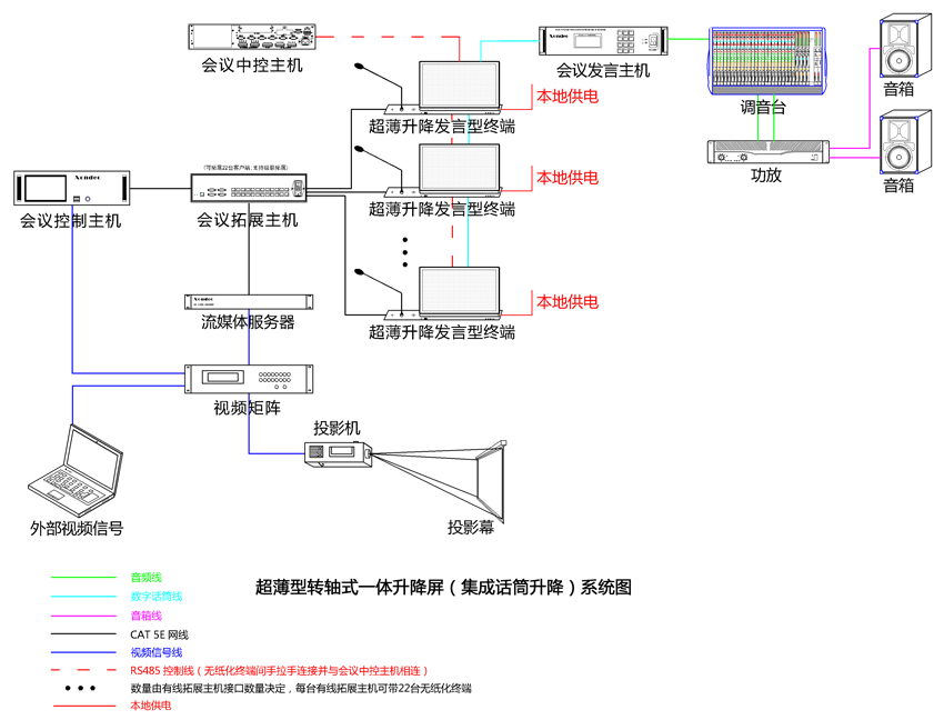 3、系統可(kě)以擴展第三方網絡中控,從(cóng)而實現(xiàn)任意會(huì)議(yì)終端(經過授權)随時(shí)對(duì)周邊設備進行(xíng)控制(z↕hì);第三方中控可(kě)通(tōng)過RF/RS 485協議(yì)對(duì)升降進行(xíng≥)統一(yī)控制(zhì)。